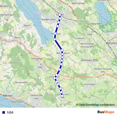 The first stop of the N84 bus route is Oetwil am See, Zentrum and the last stop is Uster, Bahnhof. N84 is operational during am Wochenende.