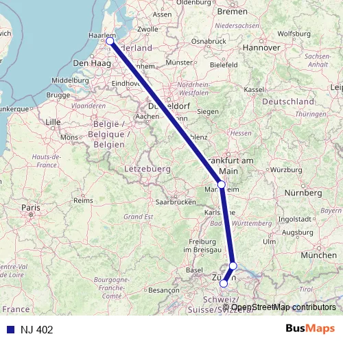 The first stop of the NJ 402 rail route is Zürich Hb and the last stop is Amsterdam Centraal. NJ 402 is operational during am Wochenende.