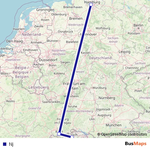 The first stop of the Nj bus route is Badischer Bahnhof and the last stop is