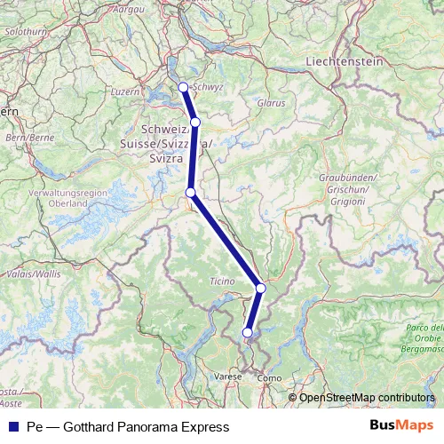 The first stop of the Pe rail route is Lugano and the last stop is Arth-Goldau. Pe (Gotthard Panorama Express) is operational during täglich.