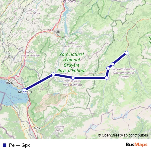 The first stop of the Pe rail route is Montreux and the last stop is Zweisimmen. Pe (Gpx) is operational during täglich.