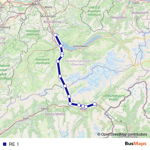 The first stop of the RE 1 rail route is Brig and the last stop is Thun. RE 1 is operational during am Wochenende.