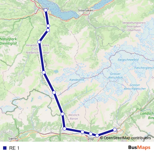 The first stop of the RE 1 rail route is Spiez and the last stop is Brig. RE 1 is operational during täglich.