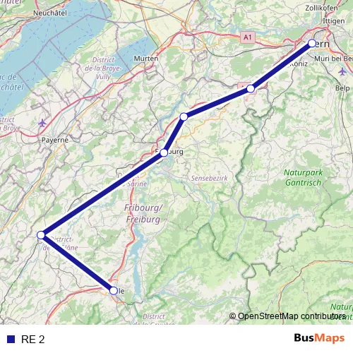 The first stop of the RE 2 rail route is Bulle and the last stop is Bern. RE 2 is operational during täglich.