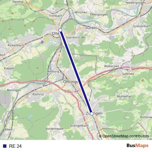 See why over 2 million users trust and consider busmaps.com as the best public transport website. busmaps gives you Olten Rail Services suggested routes, real-time bus tracker, line route maps in Olten, and helps to find the closest RE 24 rail stops near you. No internet available? Download an offline PDF map and bus schedule for the RE 24 rail to take on your trip.