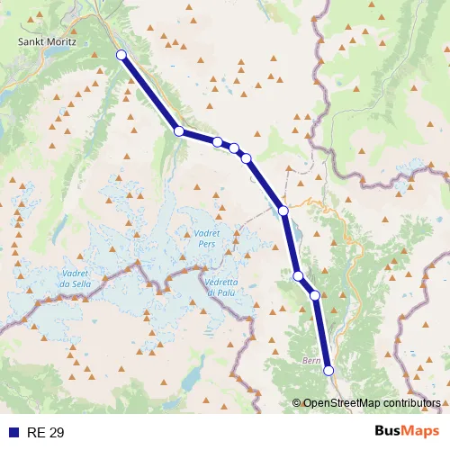 The first stop of the RE 29 rail route is Poschiavo and the last stop is Pontresina. RE 29 is operational during täglich.