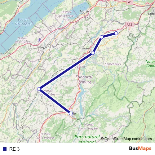 The first stop of the RE 3 rail route is Bulle and the last stop is Schmitten Fr. RE 3 is operational during an Werktagen.