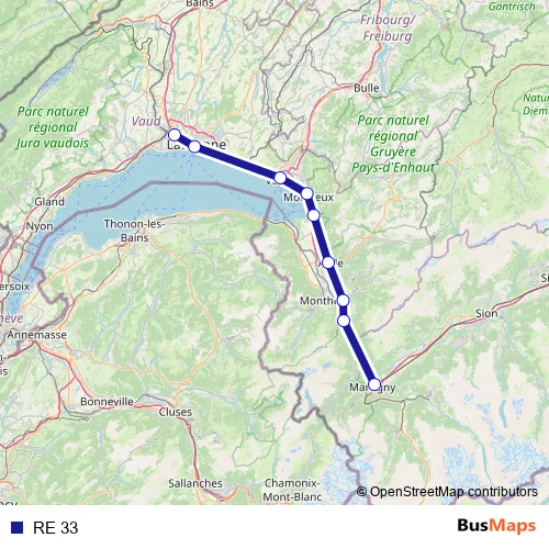 The first stop of the RE 33 rail route is Martigny and the last stop is