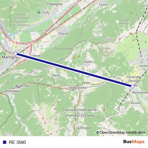 The first stop of the RE 3560 rail route is Martigny and the last stop is Le Châble Vs. RE 3560 is operational during am Wochenende.