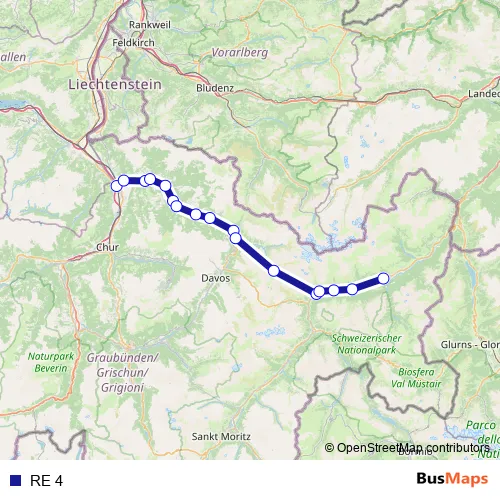 The first stop of the RE 4 rail route is Landquart and the last stop is Scuol-Tarasp. RE 4 is operational during täglich.
