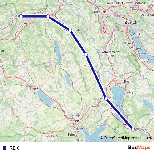 The first stop of the RE 6 rail route is Arth-Goldau and the last stop is Aarau. RE 6 is operational during am Wochenende.
