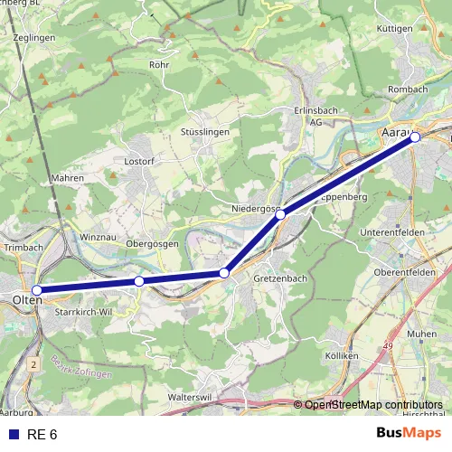 The first stop of the RE 6 rail route is Olten and the last stop is Aarau. RE 6 is operational during am Wochenende.