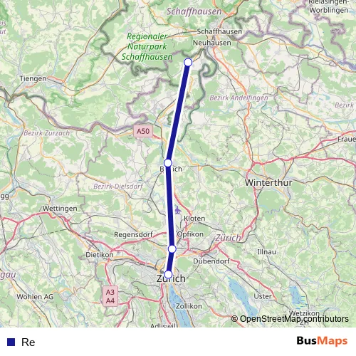 The first stop of the Re rail route is Jestetten and the last stop is Zürich Hb. Re is operational during täglich.