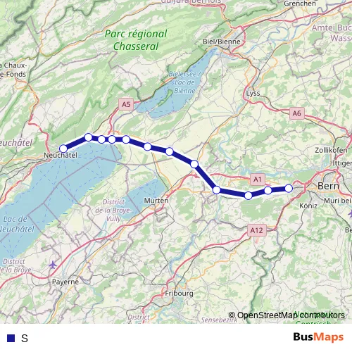 The first stop of the S rail route is Neuchâtel and the last stop is Bern Brünnen Westside. S is operational during am Wochenende.