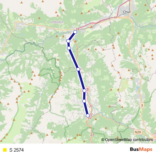 The first stop of the S 2574 rail route is Thusis and the last stop is Reichenau-Tamins. S 2574 is operational during am Wochenende.