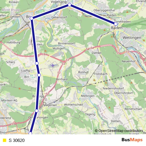 The first stop of the S 30620 rail route is Hendschiken and the last stop is Baden. S 30620 is operational during an Werktagen.