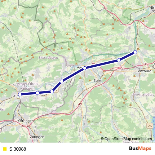 The first stop of the S 30988 rail route is Wildegg and the last stop is Olten. S 30988 is operational during an Werktagen.