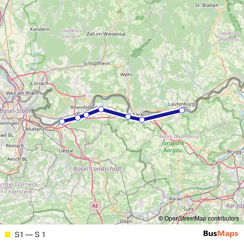 The first stop of the S1 rail route is Kaiseraugst and the last stop is Laufenburg. S1 (S 1) is operational during am Wochenende.