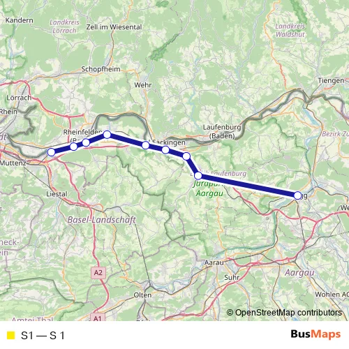 See why over 2 million users trust and consider busmaps.com as the best public transport website. busmaps gives you Rheinfelden Rail Services suggested routes, real-time bus tracker, line route maps in Rheinfelden, and helps to find the closest S1 rail stops near you. No internet available? Download an offline PDF map and bus schedule for the S1 rail to take on your trip.