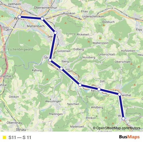 The first stop of the S11 rail route is Winterthur and the last stop is Wila. S11 (S 11) is operational during an Werktagen.