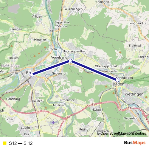 The first stop of the S12 rail route is Baden and the last stop is Brugg Ag. S12 (S 12) is operational during täglich.