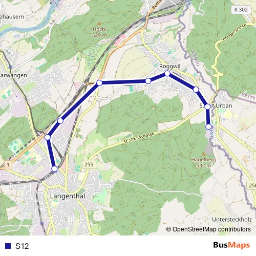 The first stop of the S12 rail route is Langenthal and the last stop is St. Urban Ziegelei. S12 is operational during täglich.