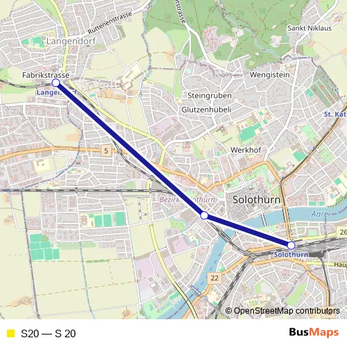 The first stop of the S20 rail route is Langendorf and the last stop is Solothurn. S20 (S 20) is operational during am Wochenende.