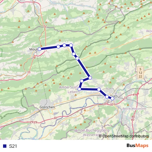 The first stop of the S21 rail route is Solothurn and the last stop is Oberdorf So. S21 is operational during täglich.
