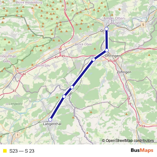 The first stop of the S23 rail route is Langenthal and the last stop is Olten. S23 (S 23) is operational during täglich.
