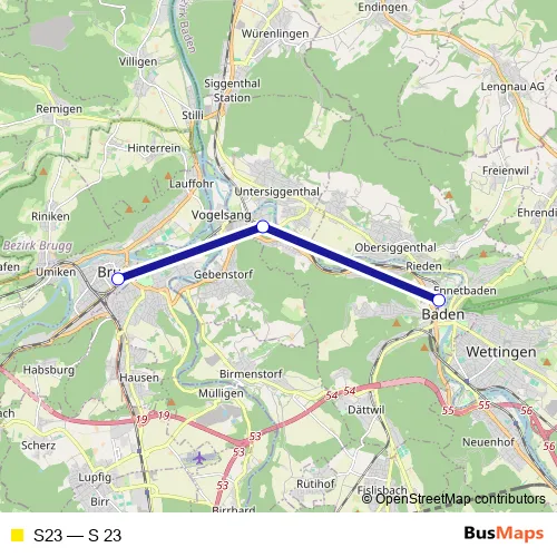 The first stop of the S23 rail route is Brugg Ag and the last stop is Baden. S23 (S 23) is operational during täglich.