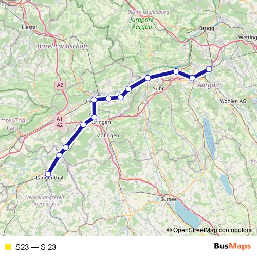 The first stop of the S23 rail route is Langenthal and the last stop is Othmarsingen. S23 (S 23) is operational during täglich.