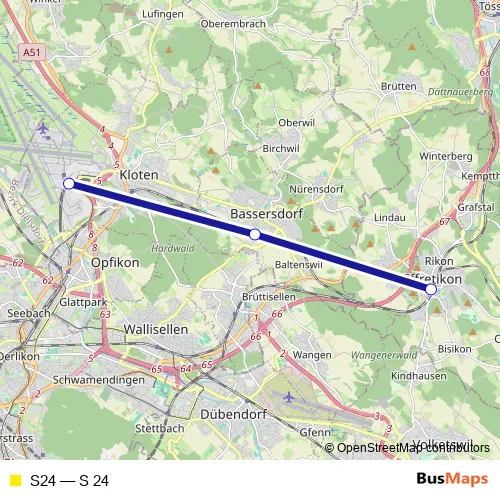 The first stop of the S24 rail route is Zürich Flughafen and the last stop is Effretikon. S24 (S 24) is operational during am Wochenende.