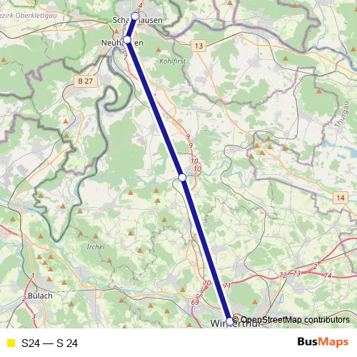 The first stop of the S24 rail route is Schaffhausen and the last stop is Winterthur. S24 (S 24) is operational during am Wochenende.