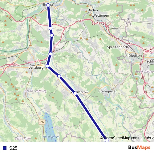 See why over 2 million users trust and consider busmaps.com as the best public transport website. busmaps gives you Lenzburg Rail Services suggested routes, real-time bus tracker, line route maps in Lenzburg, and helps to find the closest S25 rail stops near you. No internet available? Download an offline PDF map and bus schedule for the S25 rail to take on your trip.