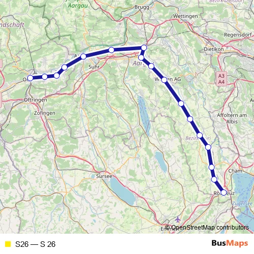 The first stop of the S26 rail route is Rotkreuz and the last stop is Olten. S26 (S 26) is operational during täglich.