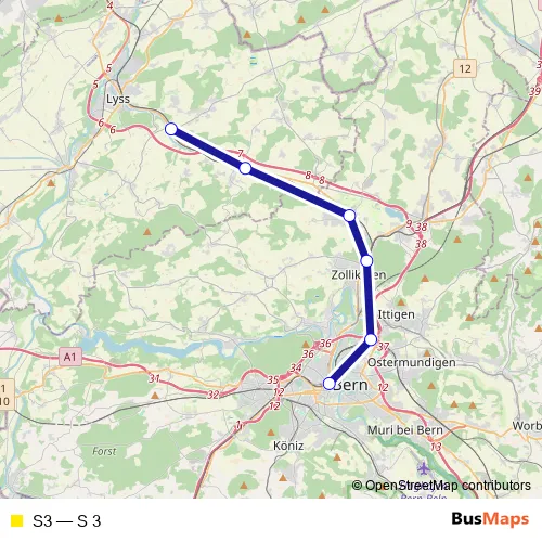 The first stop of the S3 rail route is Suberg-Grossaffoltern and the last stop is Bern. S3 (S 3) is operational during am Wochenende.