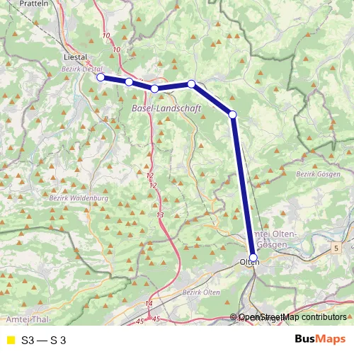 The first stop of the S3 rail route is Olten and the last stop is Lausen. S3 (S 3) is operational during am Wochenende.