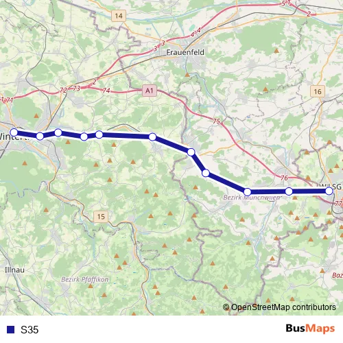 The first stop of the S35 rail route is Wil Sg and the last stop is Winterthur. S35 is operational during täglich.