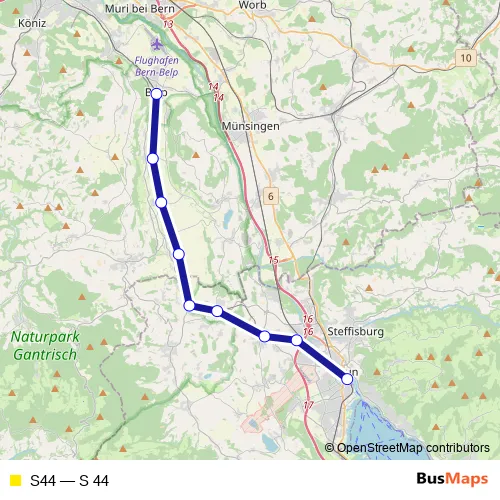The first stop of the S44 rail route is Thun and the last stop is Belp. S44 (S 44) is operational during täglich.
