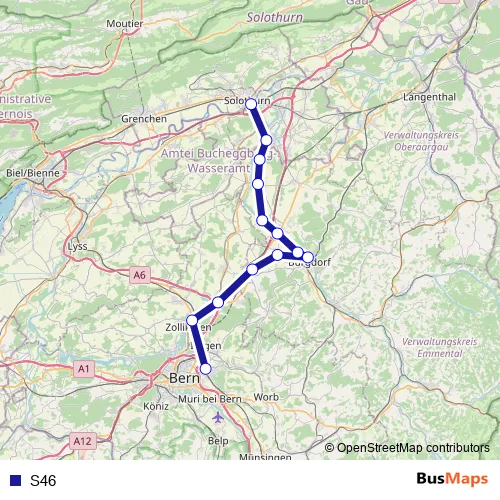 The first stop of the S46 rail route is Solothurn and the last stop is Ostermundigen. S46 is operational during an Werktagen.