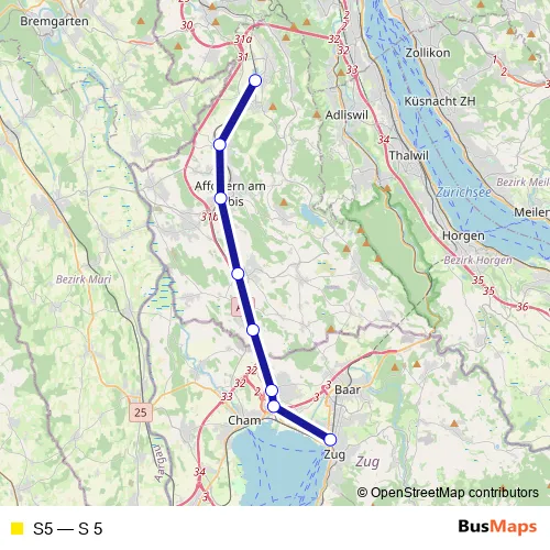 The first stop of the S5 rail route is Bonstetten-Wettswil and the last stop is Zug. S5 (S 5) is operational during täglich.