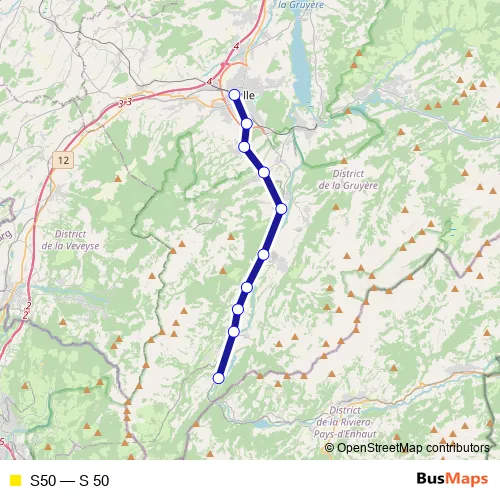 The first stop of the S50 rail route is Montbovon and the last stop is Bulle. S50 (S 50) is operational during täglich.
