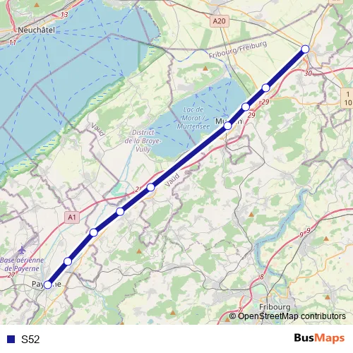The first stop of the S52 rail route is Murten/Morat and the last stop is Kerzers. S52 is operational during täglich.