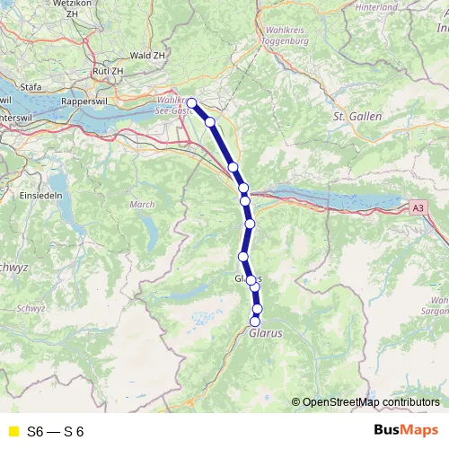 The first stop of the S6 rail route is Uznach and the last stop is Schwanden Gl. S6 (S 6) is operational during am Wochenende.
