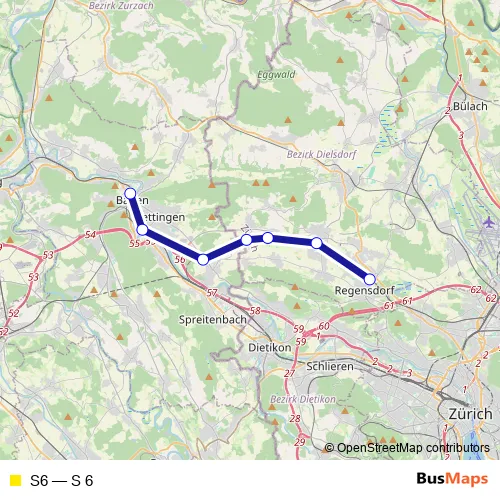 The first stop of the S6 rail route is Regensdorf-Watt and the last stop is Baden. S6 (S 6) is operational during täglich.
