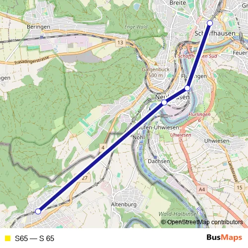 See why over 2 million users trust and consider busmaps.com as the best public transport website. busmaps gives you Schaffhausen Rail Services suggested routes, real-time bus tracker, line route maps in Schaffhausen, and helps to find the closest S65 rail stops near you. No internet available? Download an offline PDF map and bus schedule for the S65 rail to take on your trip.