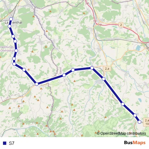 The first stop of the S7 rail route is Langenthal and the last stop is Wolhusen. S7 is operational during täglich.
