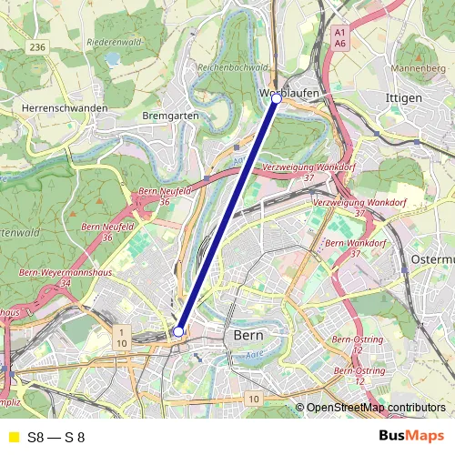 The first stop of the S8 rail route is Bern and the last stop is Worblaufen. S8 (S 8) is operational during am Wochenende.