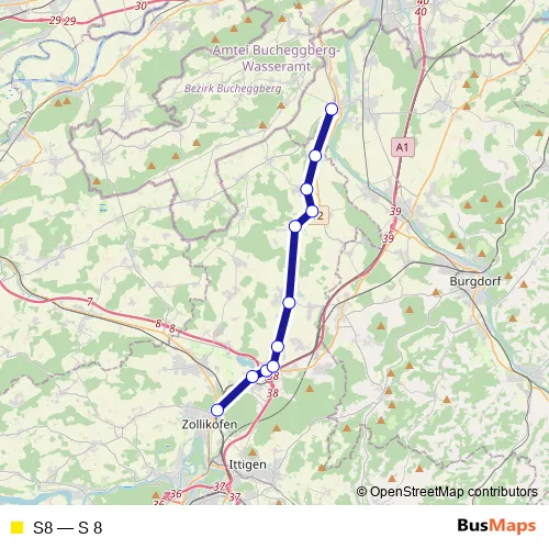 The first stop of the S8 rail route is Zollikofen and the last stop is Bätterkinden. S8 (S 8) is operational during am Wochenende.