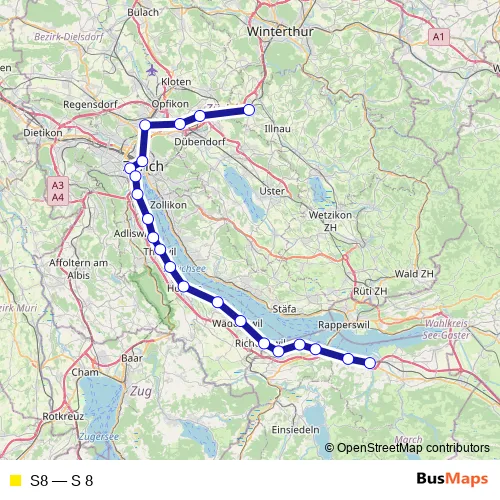 See why over 2 million users trust and consider busmaps.com as the best public transport website. busmaps gives you Zuerich Rail Services suggested routes, real-time bus tracker, line route maps in Zuerich, and helps to find the closest S8 rail stops near you. No internet available? Download an offline PDF map and bus schedule for the S8 rail to take on your trip.